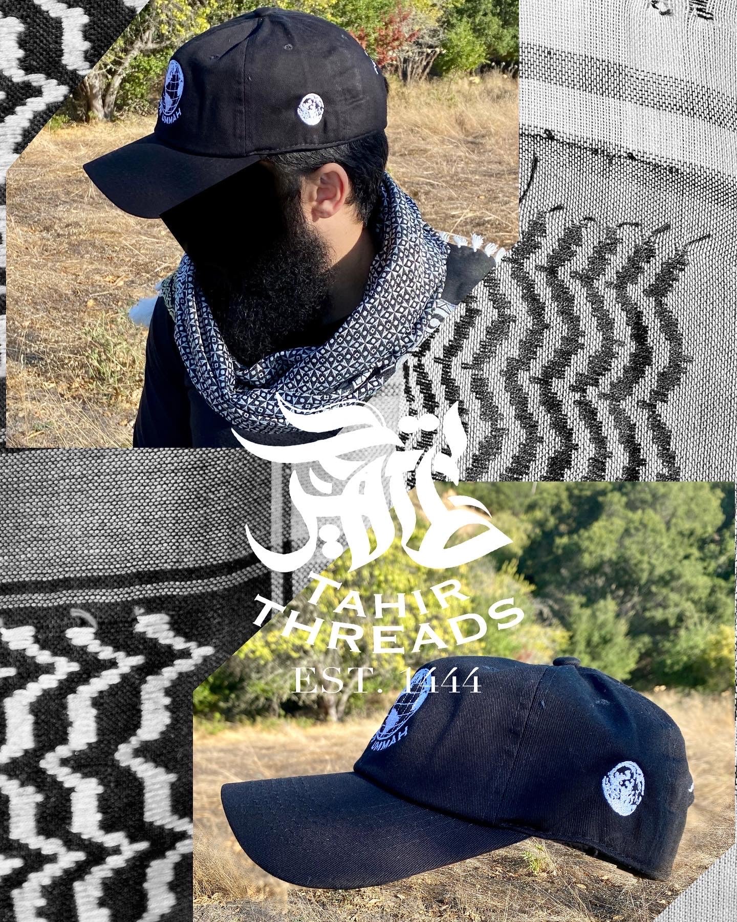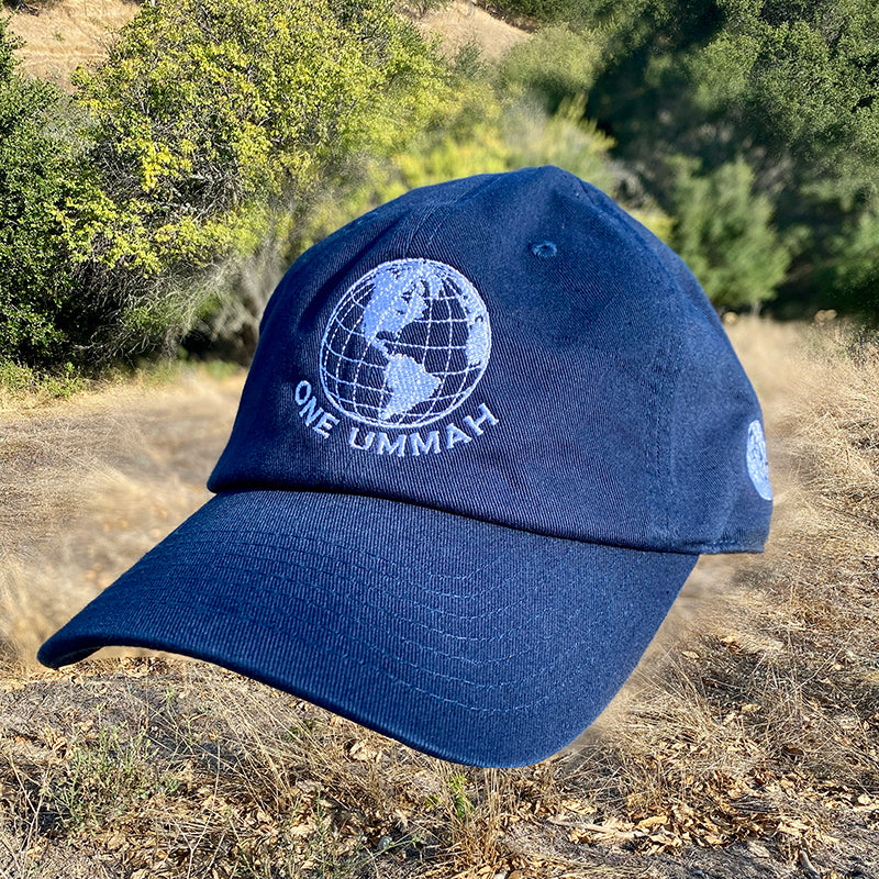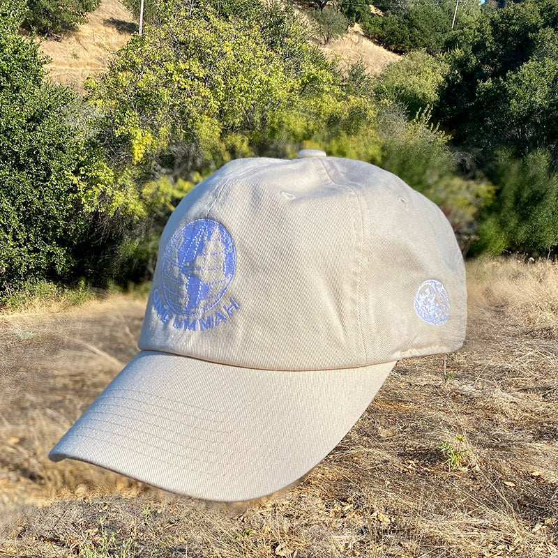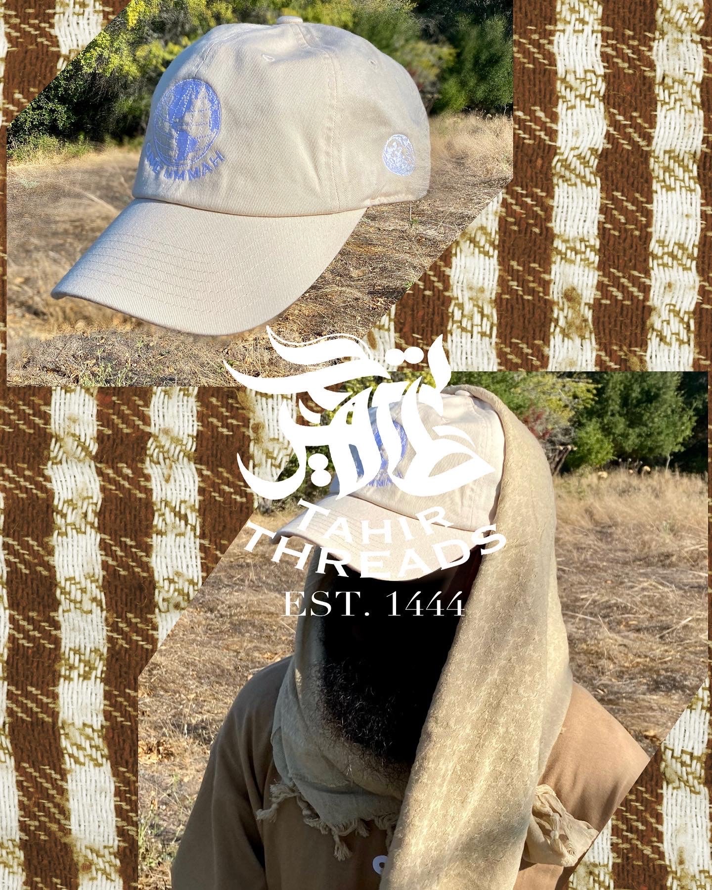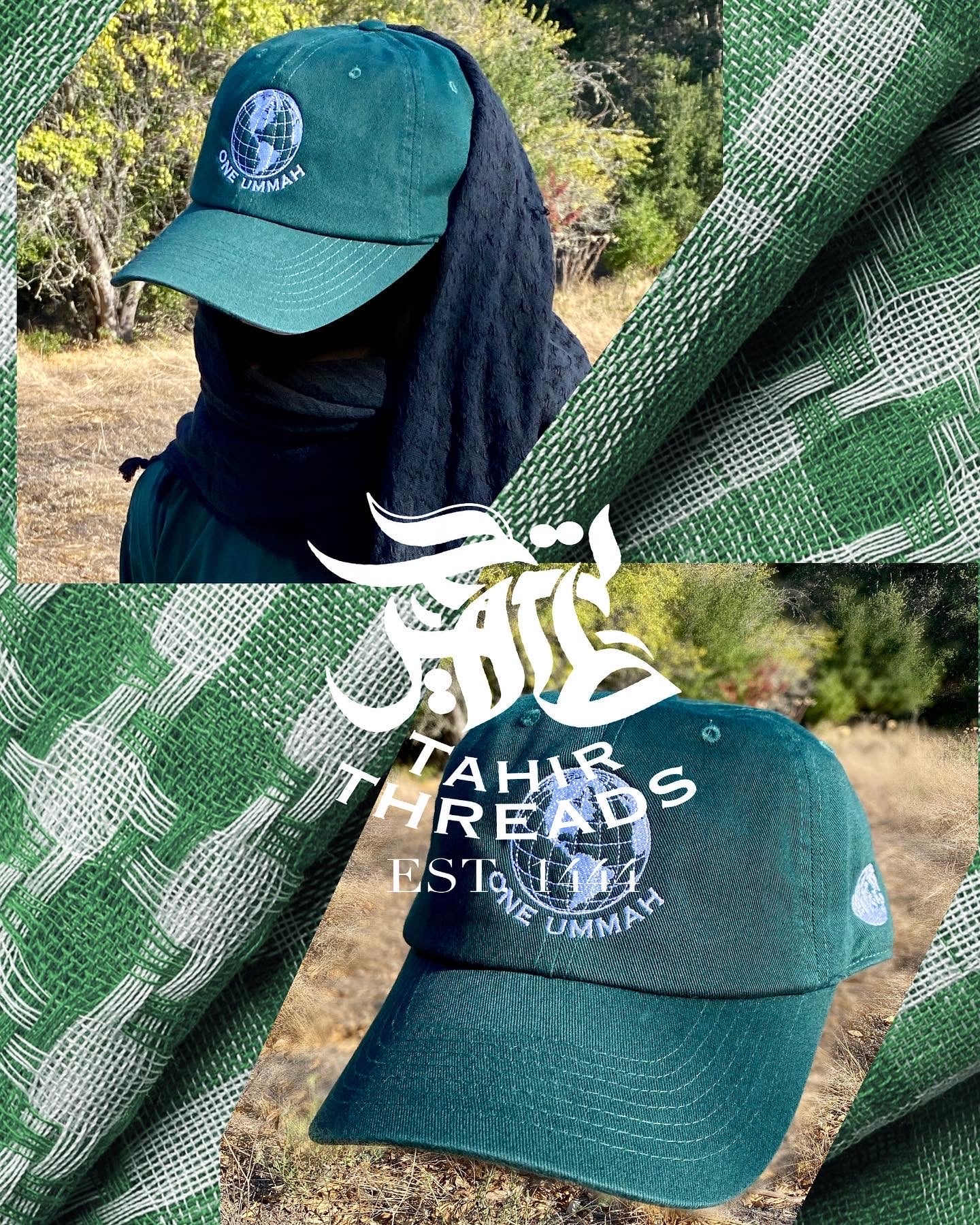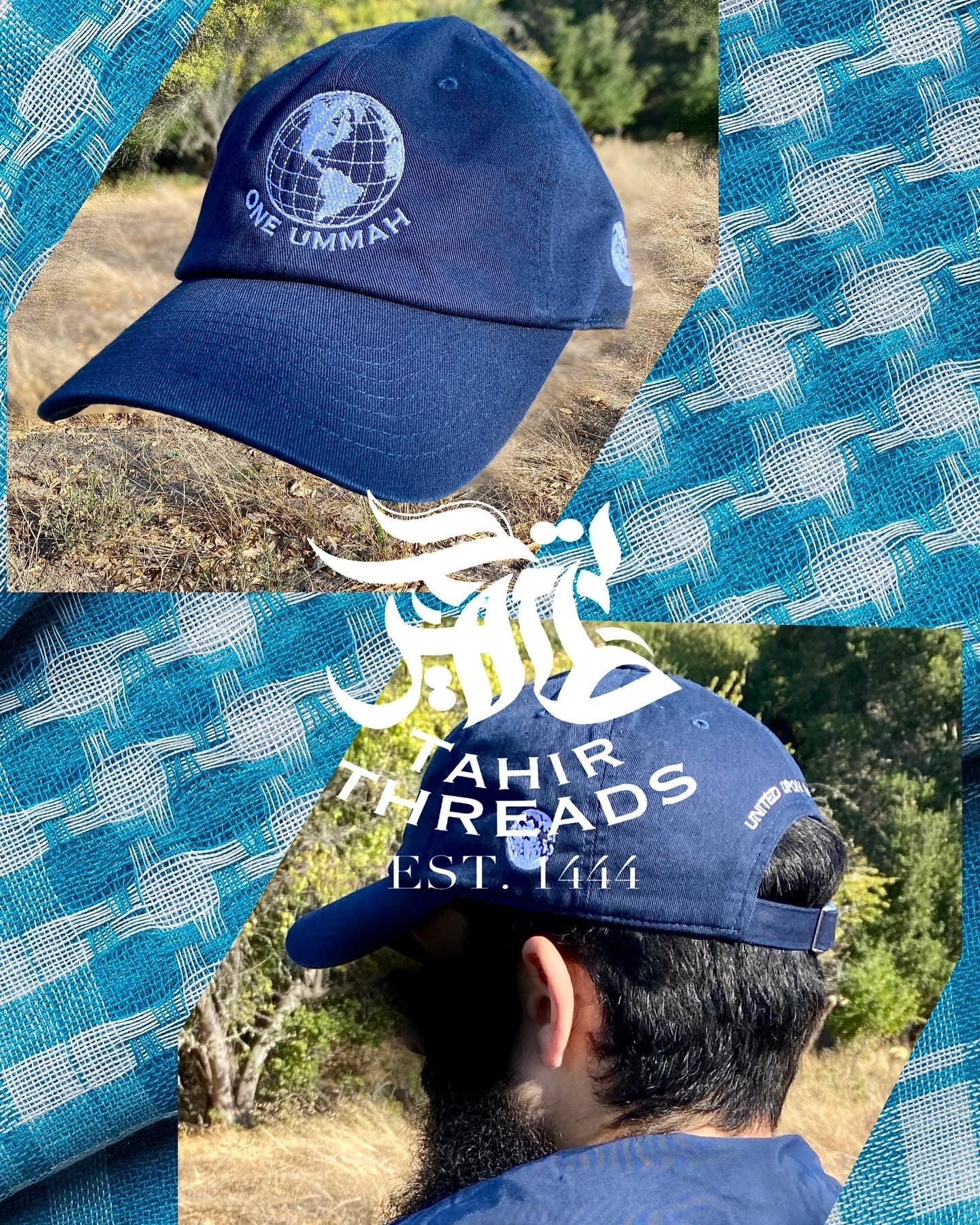 One front of the hat reads "One Ummah" with a depiction of the globe, on the left of the cap is a picture of the moon which is the initial logo of Tahir Threads, and on the back of the hat it reads "United Upon Tawheed".