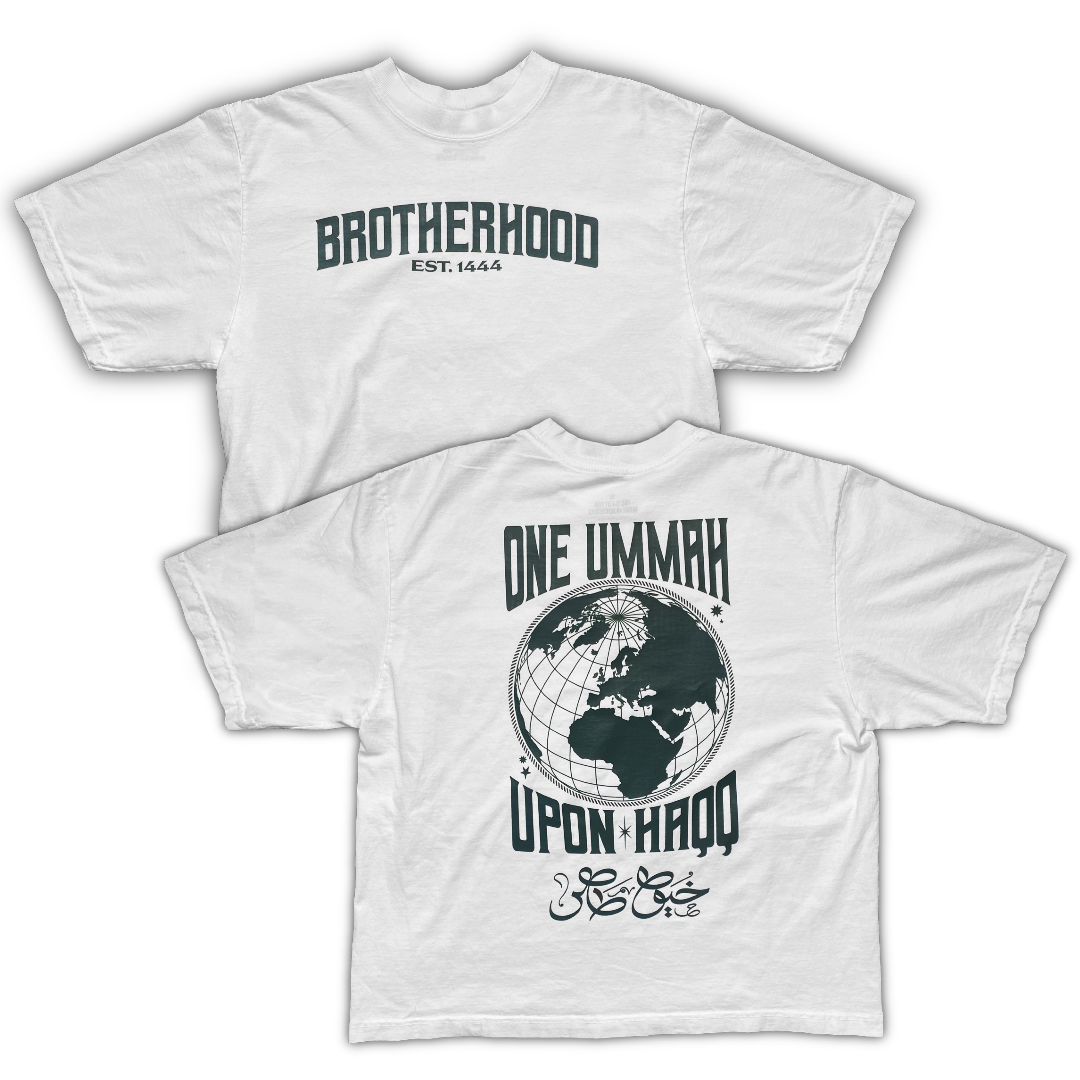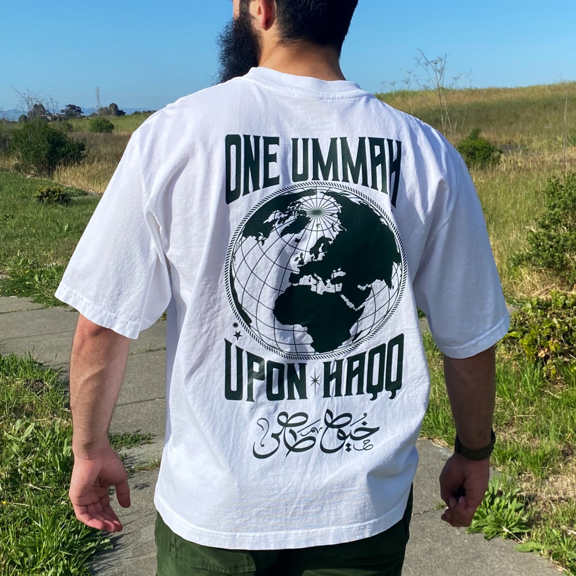 Introducing ONE UMMAH UPON HAQQ - an oversized shirt crafted with heavyweight 100% cotton, offering supreme comfort and durability. Perfect for everyday wear and lounging, this shirt is a must-have for the modern wardrobe.